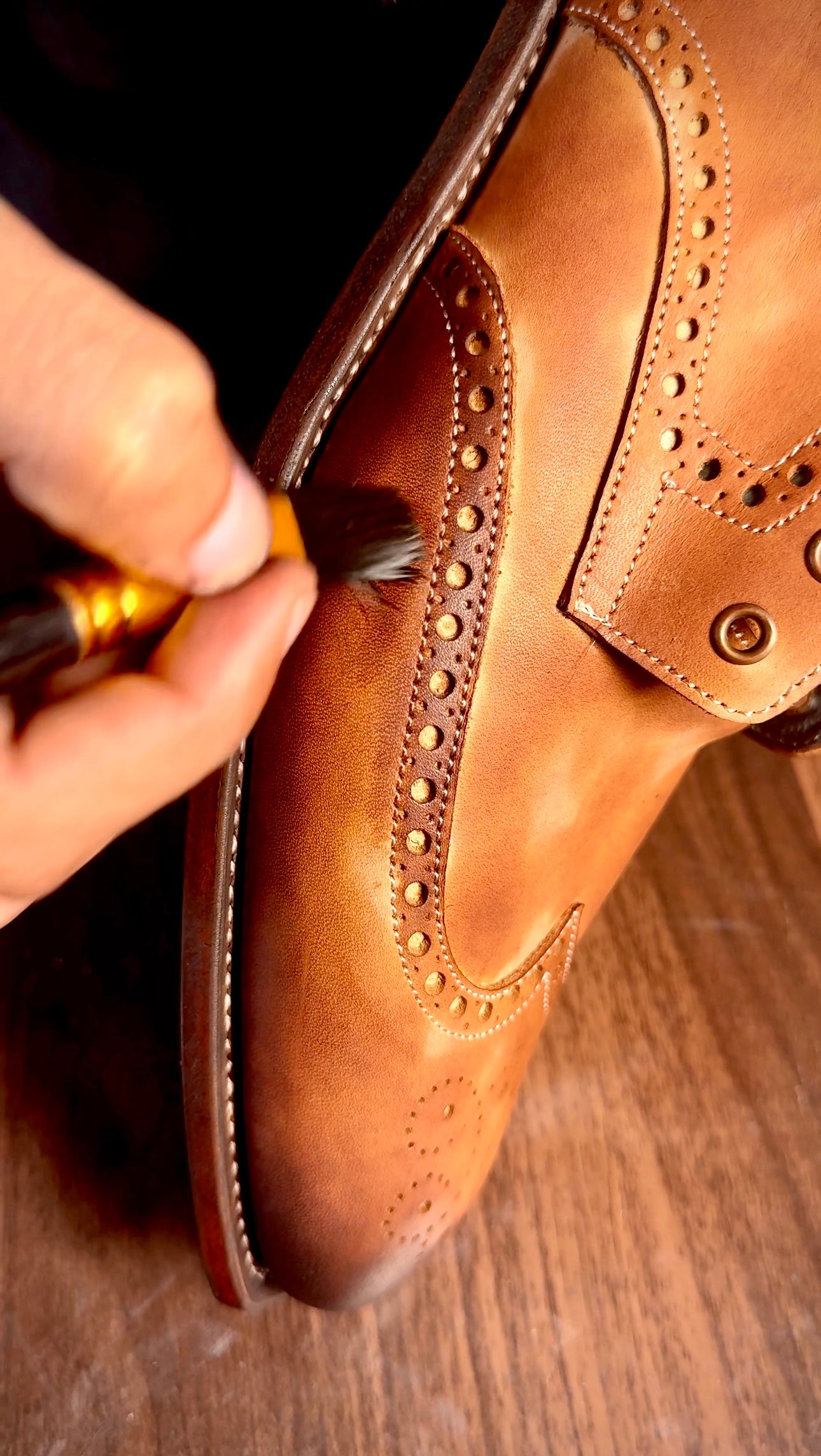Each pair is transformed into a one-of-a-kind masterpiece through the ancient art of patina. Layer by layer, natural dyes are brushed, glazed, and burnished into the leather, revealing depth, shadow, and light like a painter’s canvas. No two pairs can ever be the same — every nuance, every gradient tells its own story. Finished with Saphir Médaille d’Or, the surface glows with a richness and luminosity found only in the world’s most prestigious ateliers.